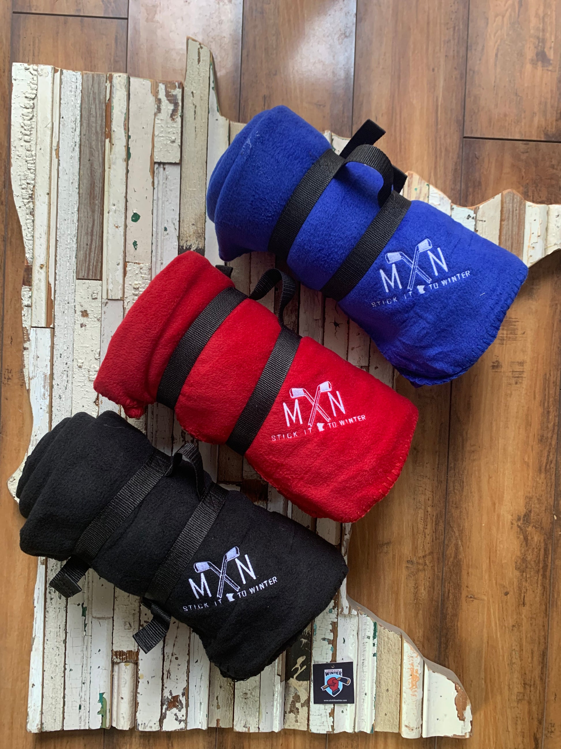 Keep warm in style! These fleece blankets comes with a handle strap to be sported anywhere from hockey rinks to ice houses. Show 'em all you're ready to Stick it to Winter!